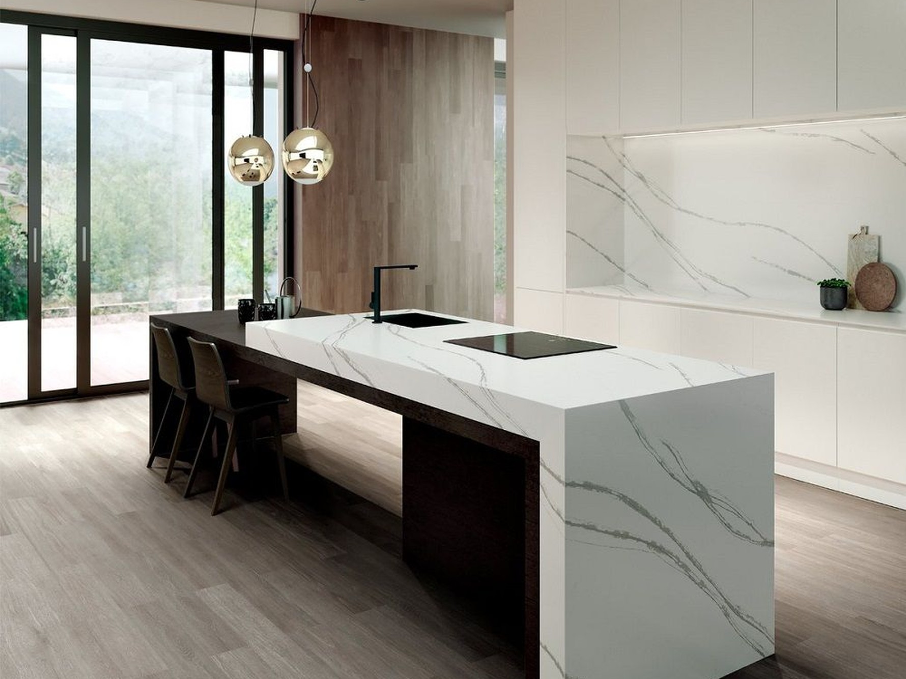 Et Bella Quartz Sile Stone complements interiors that favour light, elegant surfaces with controlled detailing. Its fine linear veining pairs naturally with white, pale grey, and soft-toned cabinetry, while also offering gentle contrast against darker units. When used on islands, waterfall edges, or full-height splashbacks, the slab maintains visual flow and continuity, allowing the pattern to enhance the space without drawing excessive focus.