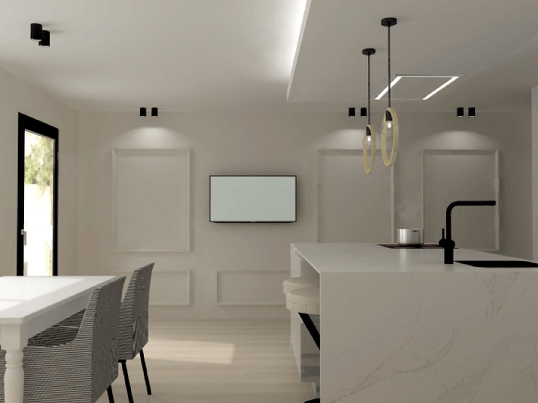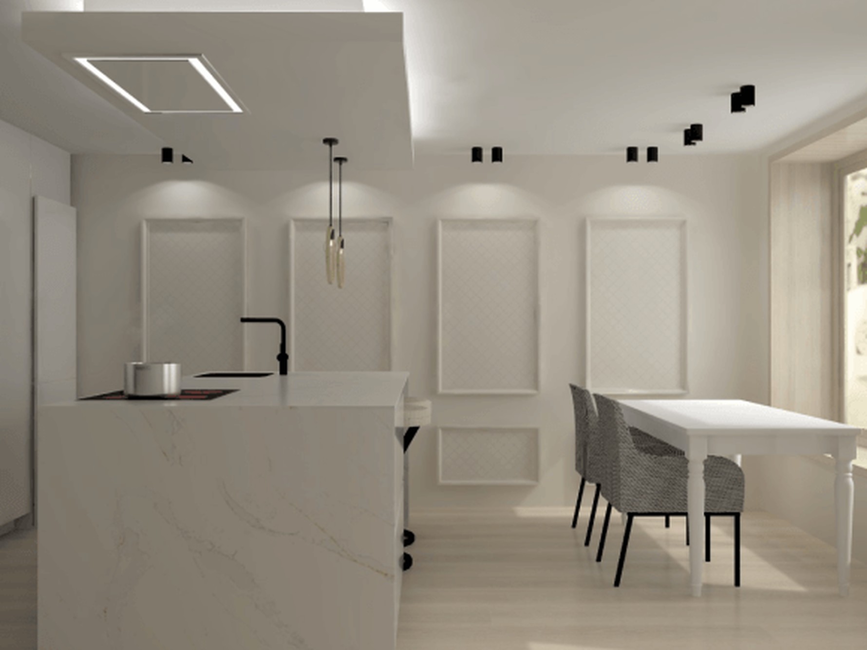 The Ethereal Glow quartz from Sile Stone slab features a bright white base softened by delicate grey veining that moves diagonally across the surface in a gentle, flowing pattern. Fine hairline veins are joined by light clouded areas and faint mineral detailing, while subtle warm-toned accents appear intermittently within the veining. This combination creates a refined, luminous surface with controlled movement that remains balanced and consistent across large worktop areas and feature installations.