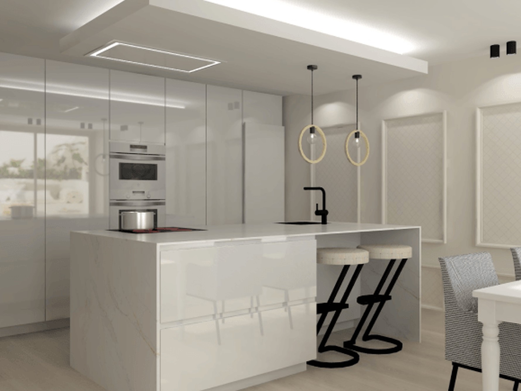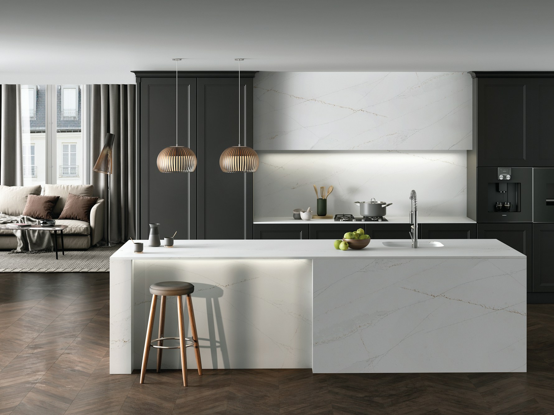 Ethereal Glow Quartz is supplied in a jumbo slab size of 3200 × 1600 mm, supporting expansive layouts with minimal joins across long worktop runs and islands. Available in both 20mm and 30mm thickness options, it accommodates slim contemporary edges as well as more substantial profiles. Mitred edges, waterfall ends, and full-height splashbacks can be specified to carry the veining naturally across surfaces and maintain visual continuity.