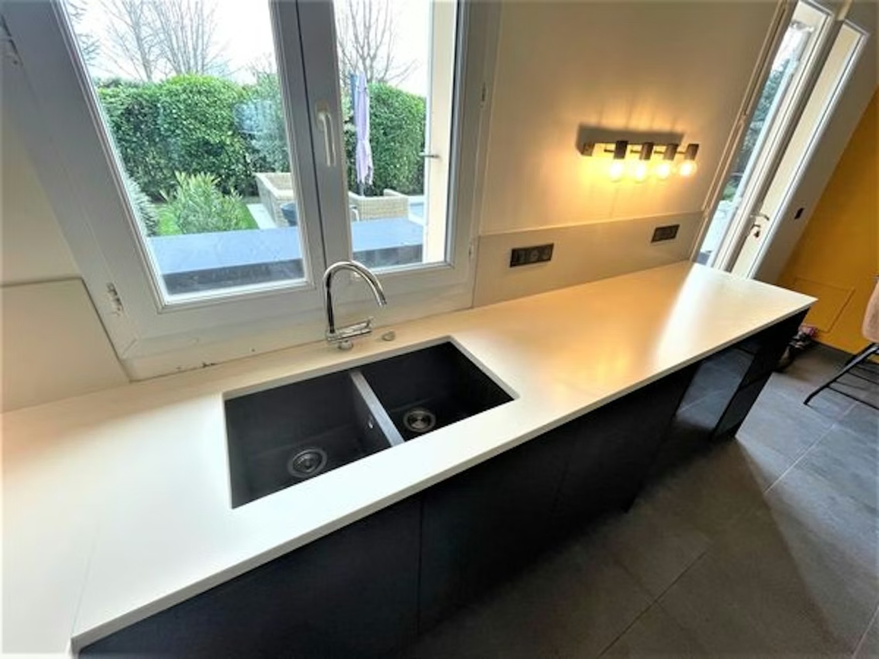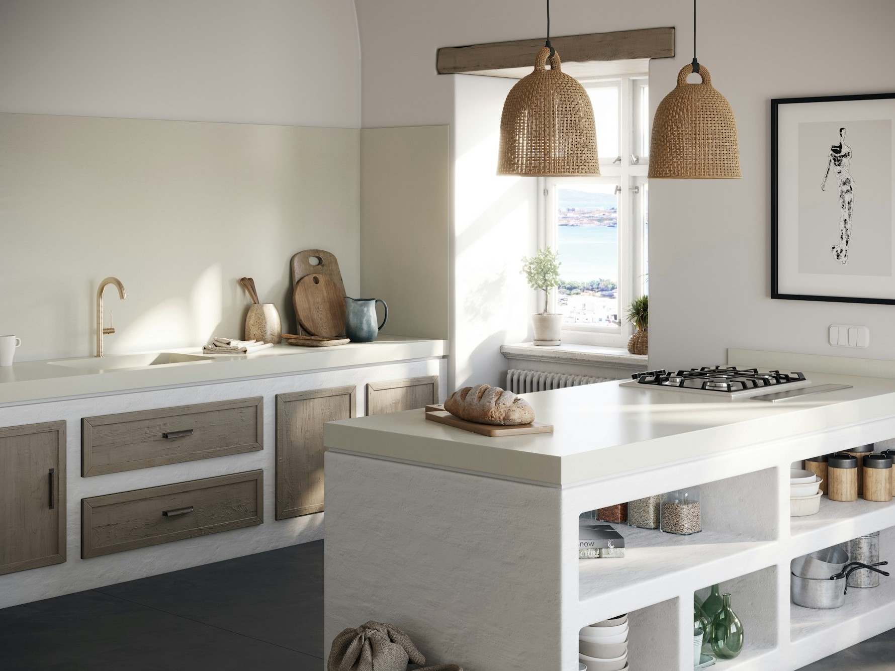 Faro White Quartz Sile Stone is ideal for interiors that prioritise simplicity, brightness, and balance. Its uniform surface pairs seamlessly with white, beige, light grey, and natural wood cabinetry, while also providing a neutral contrast against darker units. Used on islands, long worktop runs, or full-height splashbacks, the slab delivers visual continuity and a calm backdrop that allows surrounding materials and finishes to stand out.