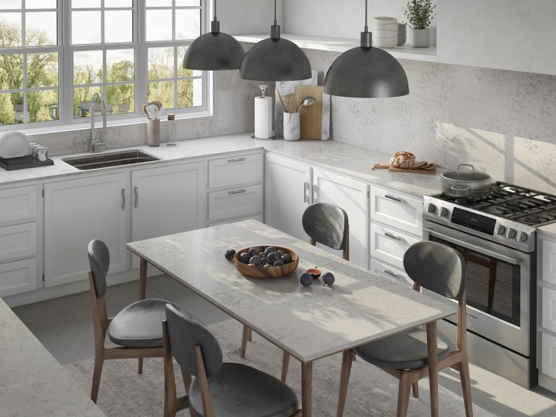 Helix Quartz Sile Stone works particularly well in interiors that favour soft textures and understated detailing. Its gentle marbling complements white, light grey, and neutral cabinetry, while also balancing darker finishes without appearing heavy. When used on kitchen islands, waterfall ends, or full-height splashbacks, the slab maintains visual flow and continuity, enhancing the space without overpowering surrounding materials.