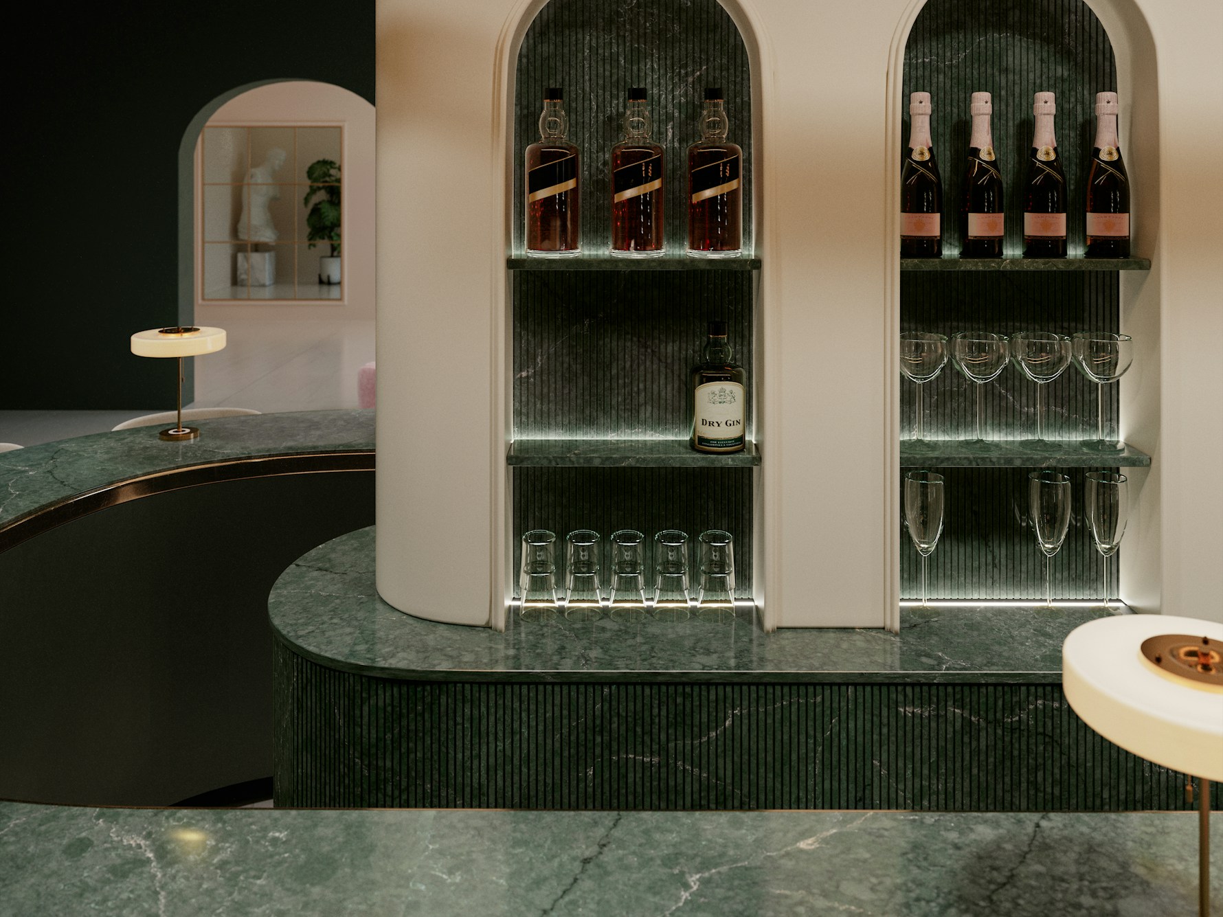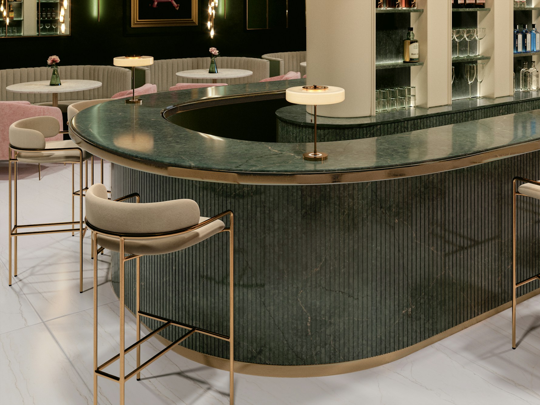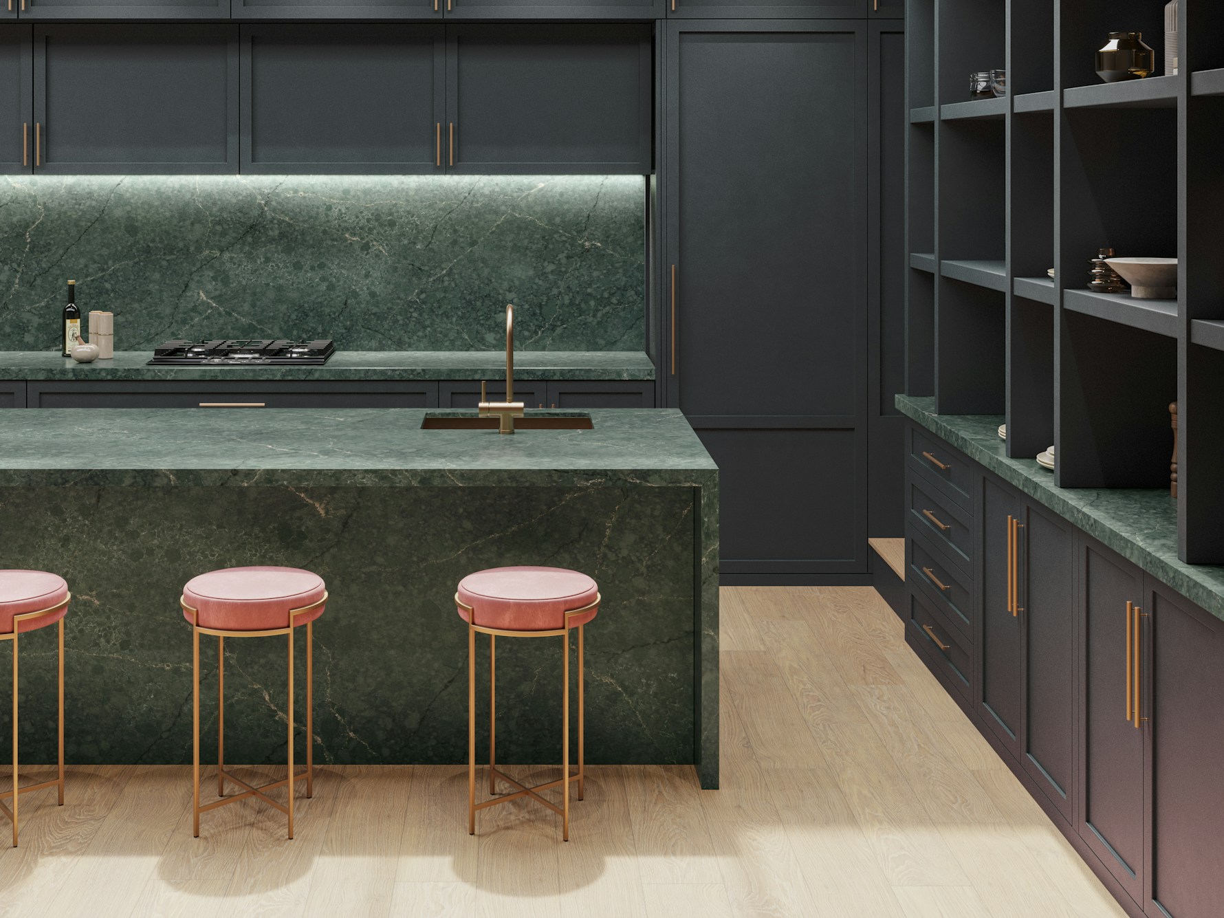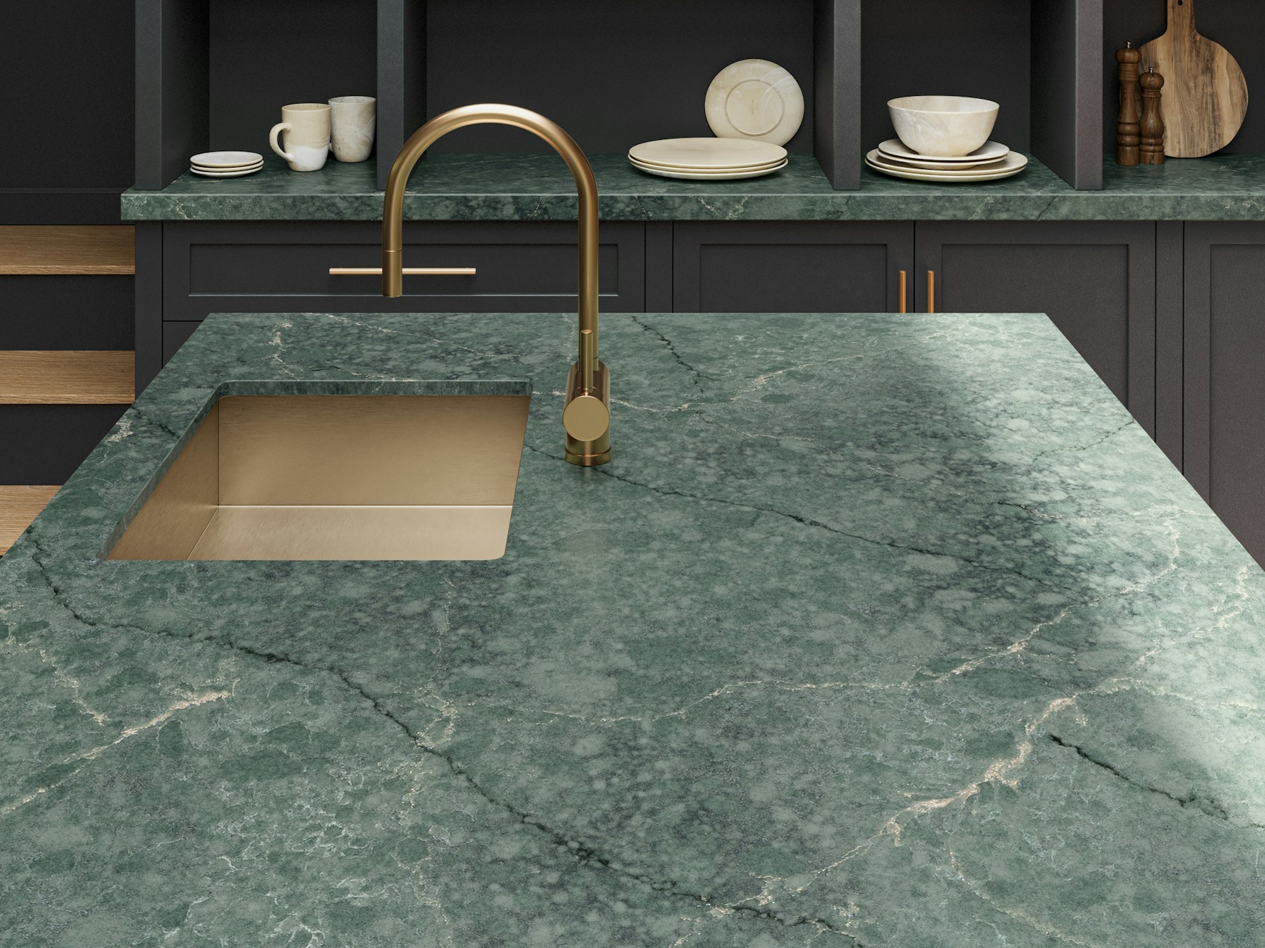 Jardin Emerald Quartz is supplied in a jumbo slab size of 3200 × 1600 mm, allowing for expansive layouts with minimal joins across long worktop runs and islands. Available in both 20mm and 30mm thickness options, it supports slim contemporary edges as well as more substantial profiles. Mitred edges, waterfall ends, and full-height splashbacks can be specified to carry the natural patterning seamlessly across surfaces.