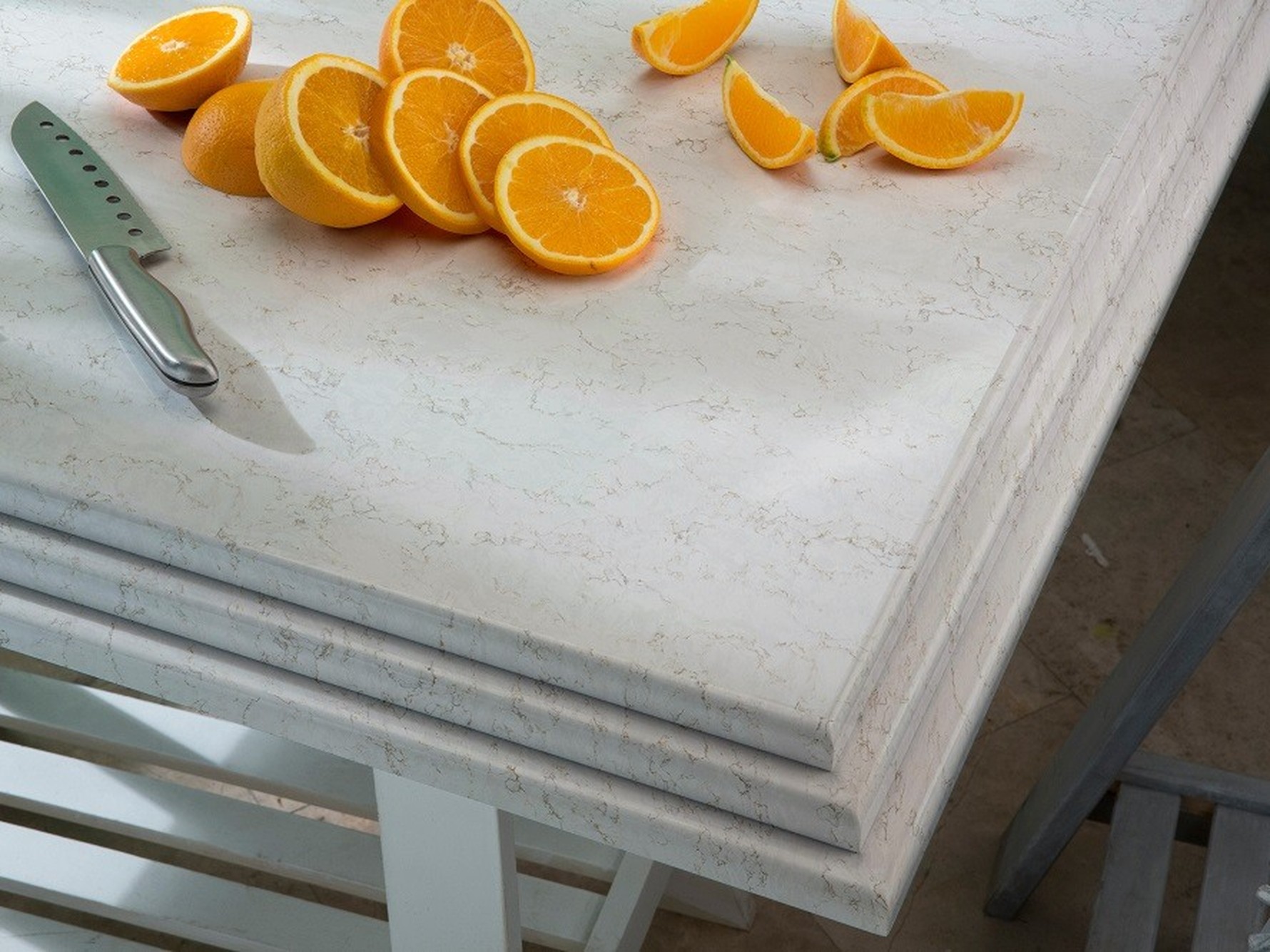 Lusso Quartz is supplied in a jumbo slab size of 3200 × 1600 mm, allowing for expansive layouts with minimal joins across long worktop runs and islands. Available in both 20mm and 30mm thickness options, it supports slim contemporary edge profiles as well as more substantial designs. Mitred edges, waterfall ends, and full-height splashbacks can be specified to carry the veining naturally across surfaces and maintain visual continuity.
