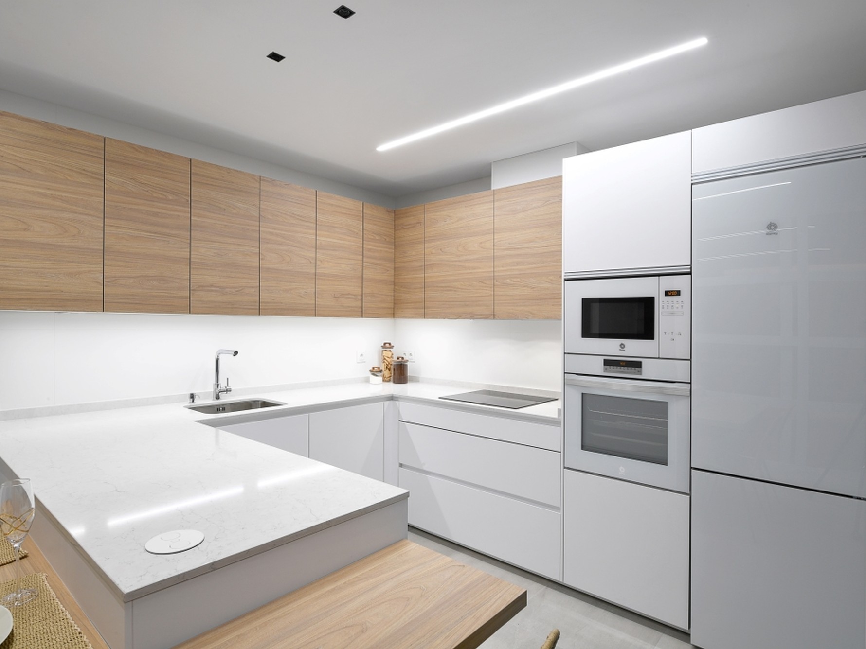 Pearl Jasmine Quartz Sile Stone works particularly well in interiors that favour light, elegant surfaces with understated detailing. Its soft veining pairs naturally with white, cream, light grey, and pale wood cabinetry, while also providing gentle contrast against darker units without appearing stark. Used across islands, waterfall ends, or full-height splashbacks, the slab maintains visual continuity and a calm, open feel.