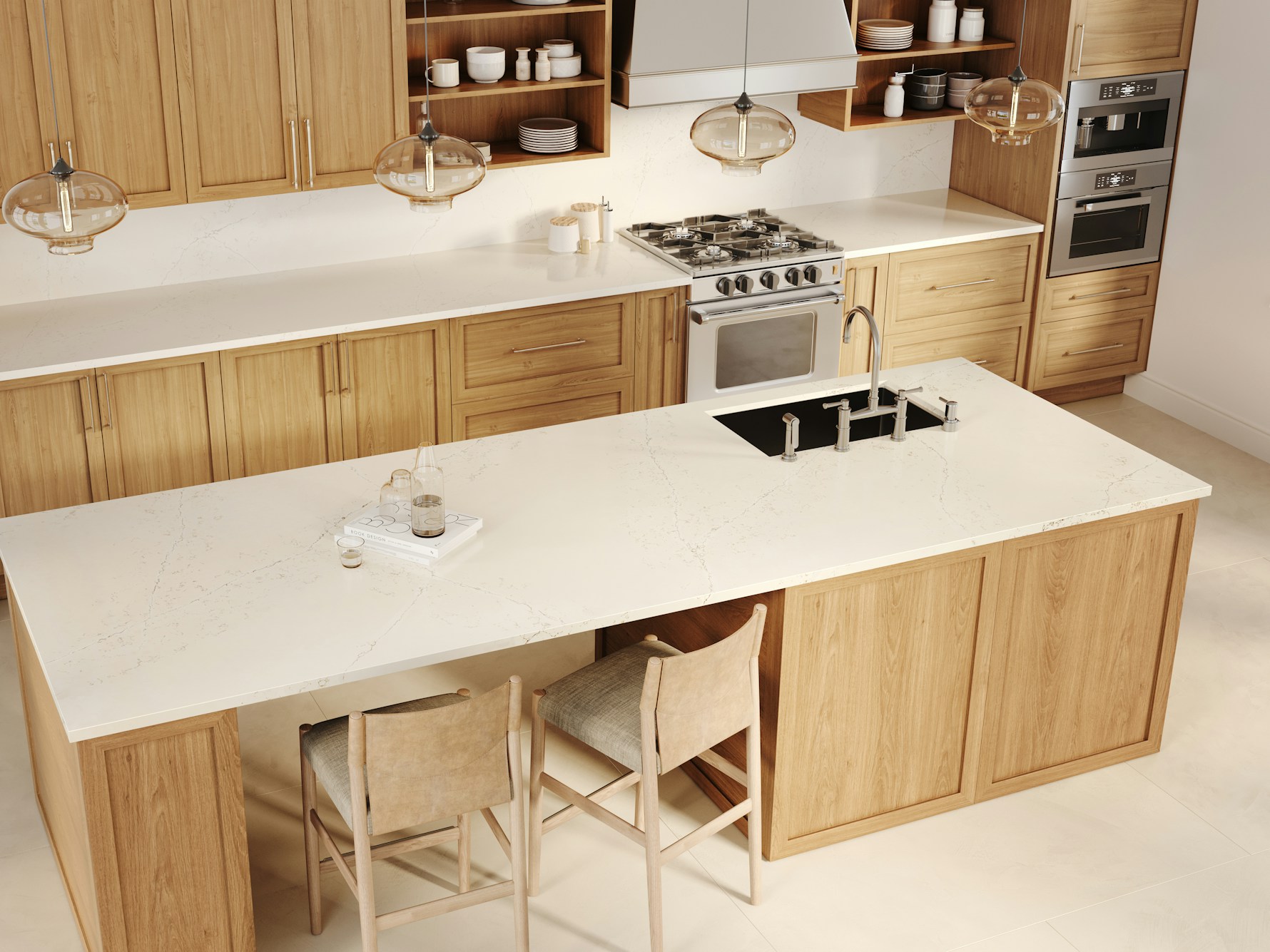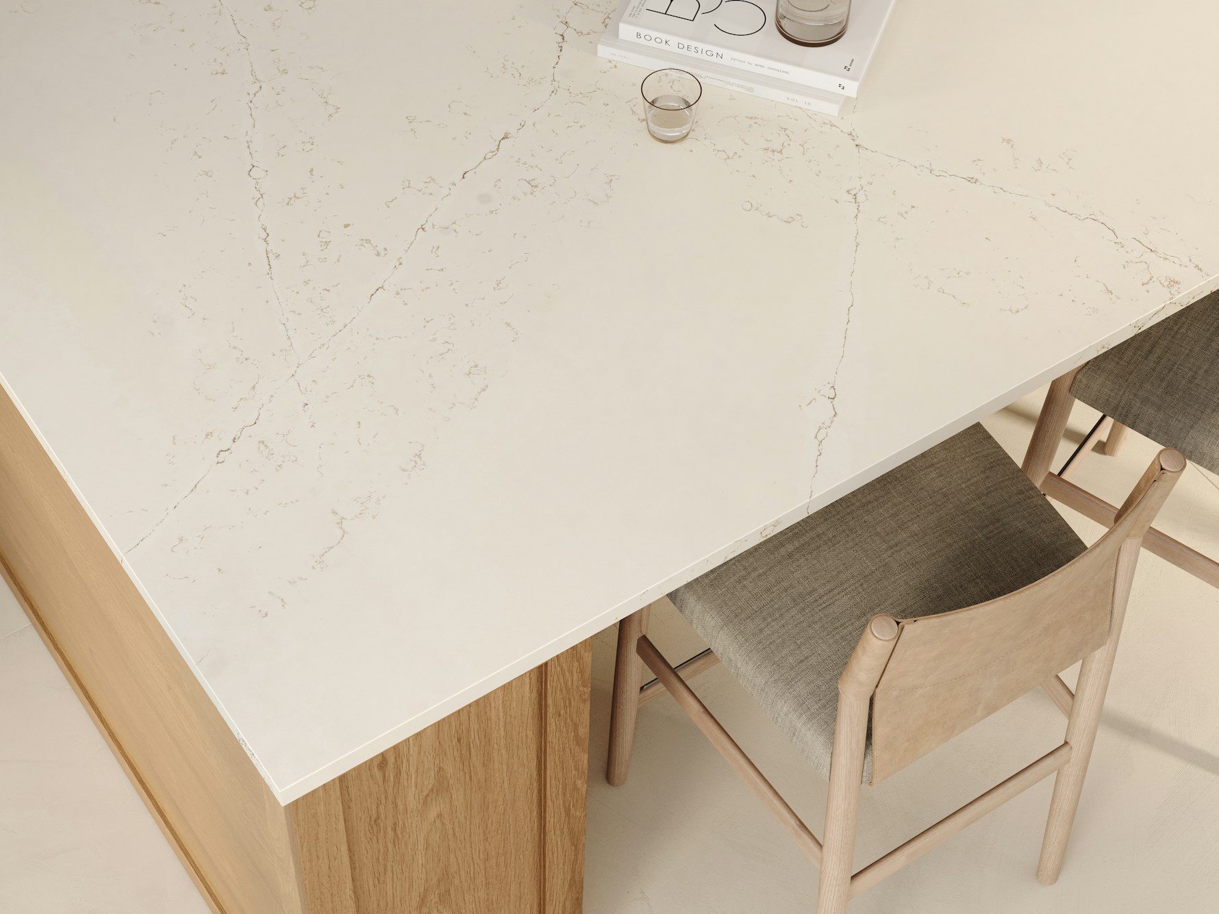 Siberian Quartz is supplied in a jumbo slab size of 3200 × 1600 mm, supporting expansive layouts with minimal joins across long worktop runs and islands. Available in both 20mm and 30mm thickness options, it accommodates slim contemporary edges as well as more substantial profiles. Mitred edges, waterfall ends, and full-height splashbacks can be specified to carry the subtle veining naturally across surfaces and maintain visual continuity.