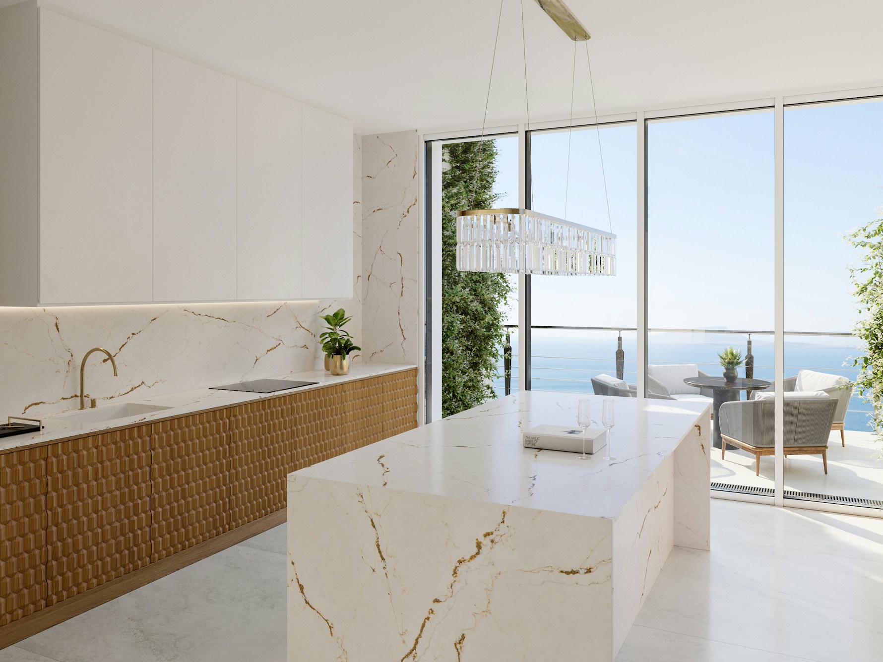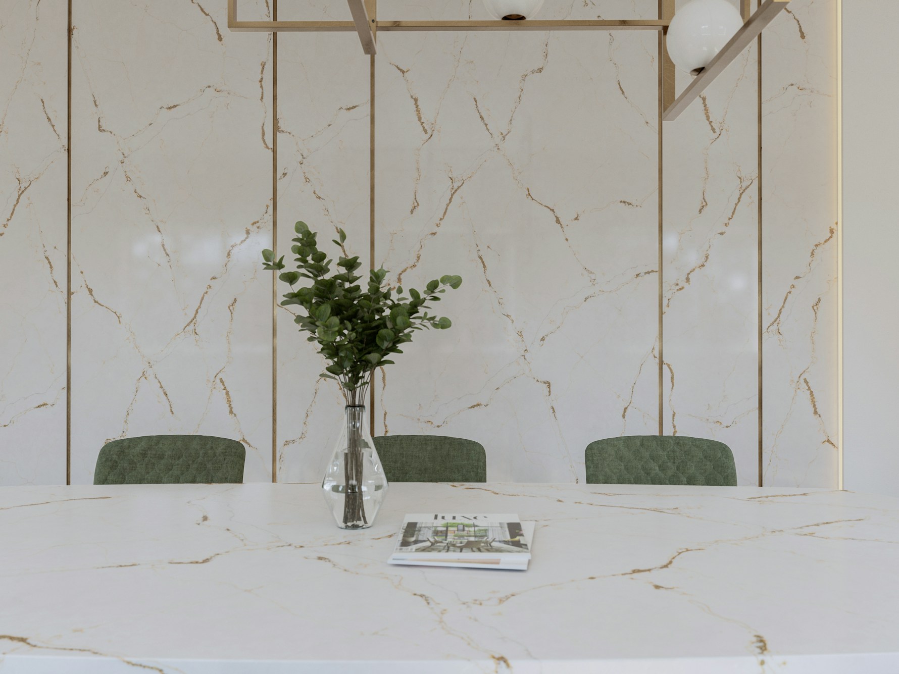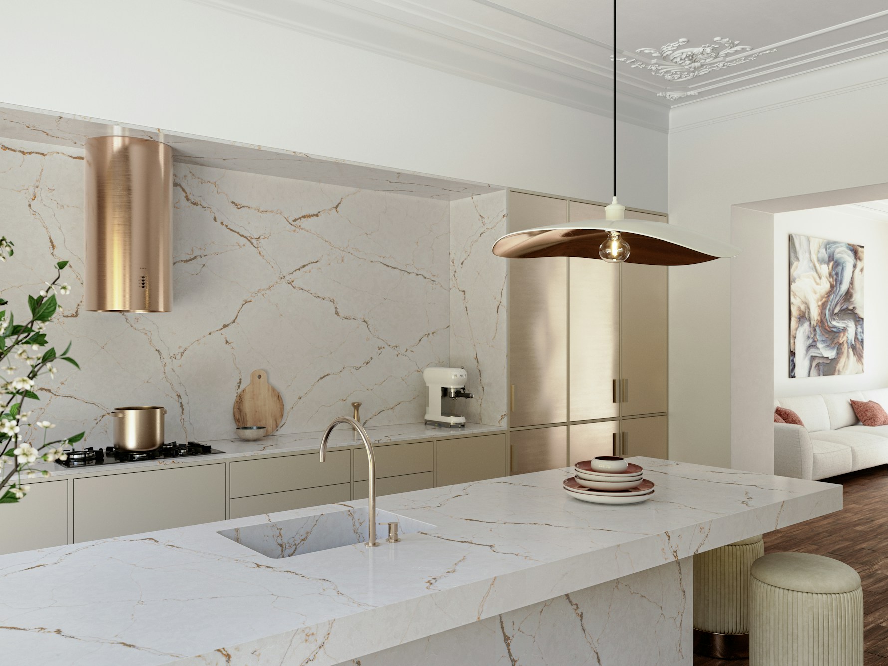 Versailles Ivory Quartz is supplied in a jumbo slab size of 3200 × 1600 mm, supporting expansive layouts with minimal joins across long worktop runs and islands. Available in both 20mm and 30mm thickness options, it accommodates slim contemporary edges as well as more substantial profiles. Mitred edges, waterfall ends, and full-height splashbacks allow the veining to flow naturally across surfaces and maintain visual continuity.