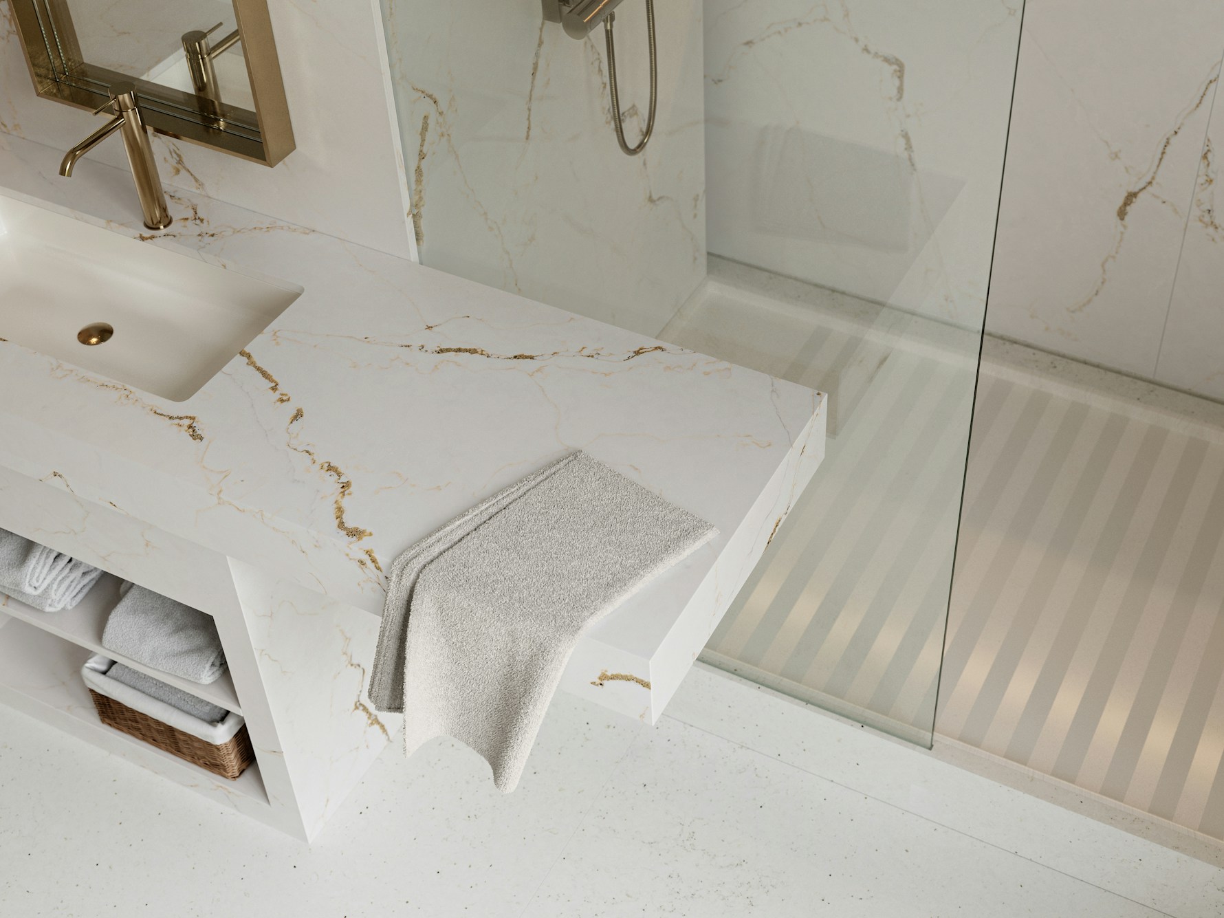 Careful planning of vein direction, joins, and edge profiles ensures Versailles Ivory Quartz reads naturally across sinks, corners, and feature ends. Accurate slab alignment and detailing help preserve the slab’s elegant movement while supporting long-term performance in everyday environments.