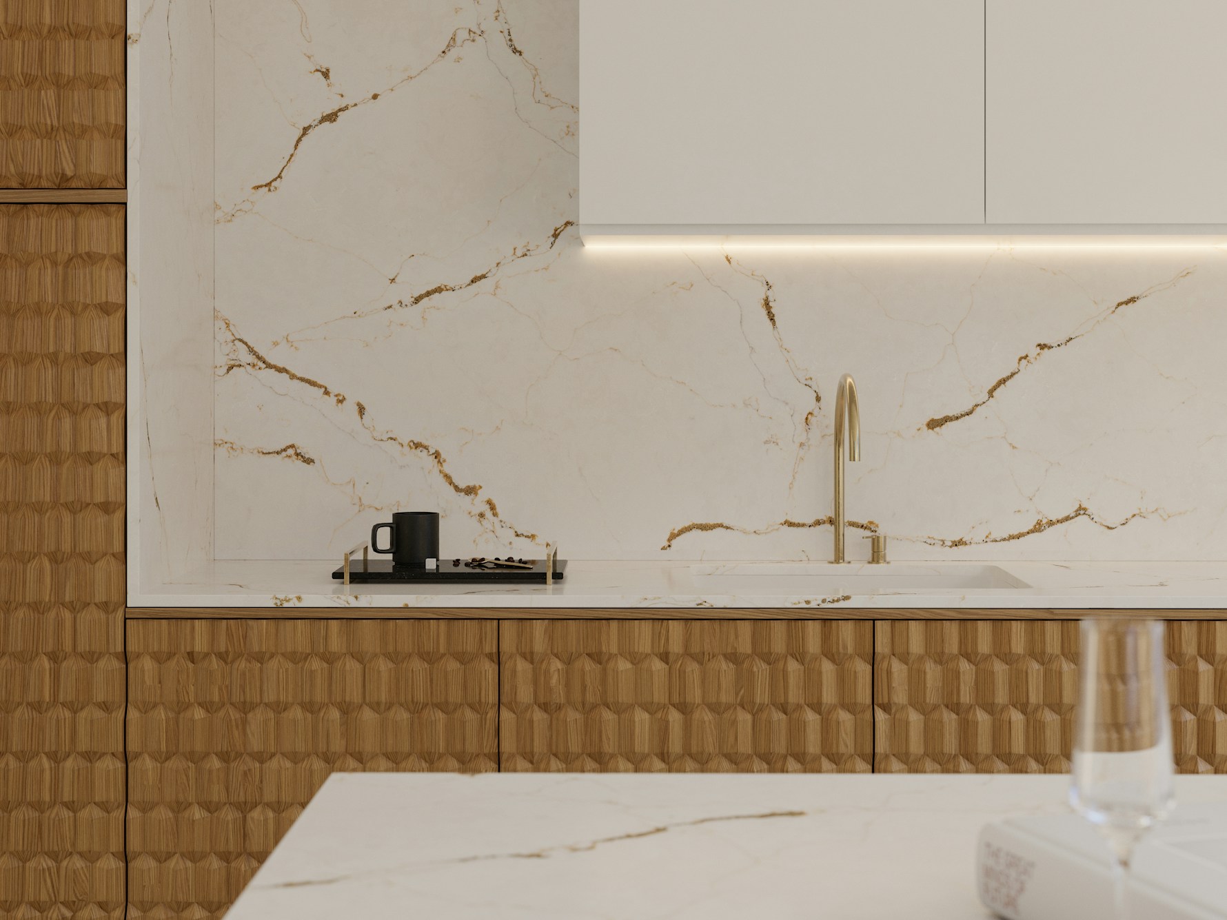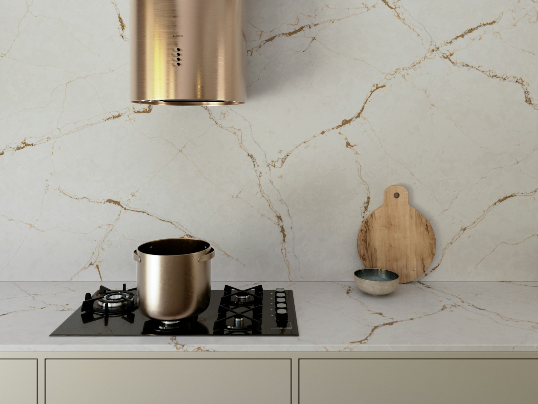 Versailles Ivory Quartz Sile Stone works beautifully in interiors that favour warmth, elegance, and statement detailing. Its gold-toned veining pairs naturally with cream, taupe, and natural wood cabinetry, while also complementing brass, gold, and brushed metal finishes. Used on kitchen islands, waterfall ends, or full-height splashbacks, the slab provides visual flow and a luxurious focal point without appearing overly bold.